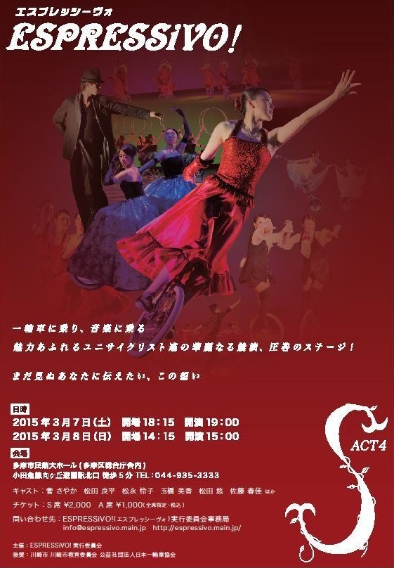 ESPRESSiVO!ACT4~S~ 「一輪車に乗り、音楽に乗る 魅力あふれるユニサイクリスト達の華麗なる演技、圧巻のステージ! まだ見ぬあなたに伝えたい、この想い」 一輪車演技をより広く沢山の方に知ってほしい、楽しんでいただきたい、 という願いから始まった「ESPRESSiVO!」。 好評のうちに幕を閉じたACT3~Re~から約4年、今回も表情豊かな実力派達が顔を揃えました。 エンターテイメントとしての舞台を目指し一丸となって製作に取り組んでいます。 ユニサイクリストの皆様をはじめ関係者の方々、一輪車にご興味のある方々、 ぜひご来場ください。 日時 : 2015年3月7日(土)開場18時15分 開演19時00分 2015年3月8日(日)開場14時15分 開演15時00分 会場 : 多摩市民館大ホール(神奈川県川崎市多摩区登戸1775-1) 出演 : 菅さやか、松田良平、松永怜子、玉橋美香、松田悠、他 チケット:S席2000円、A席1000円(全席指定・税込) ホームページにて受付 http://espressivo.main.jp (上記記事は、ESPRESSiVO実行委員会様の許可をいただき、掲載させていただいております。) |