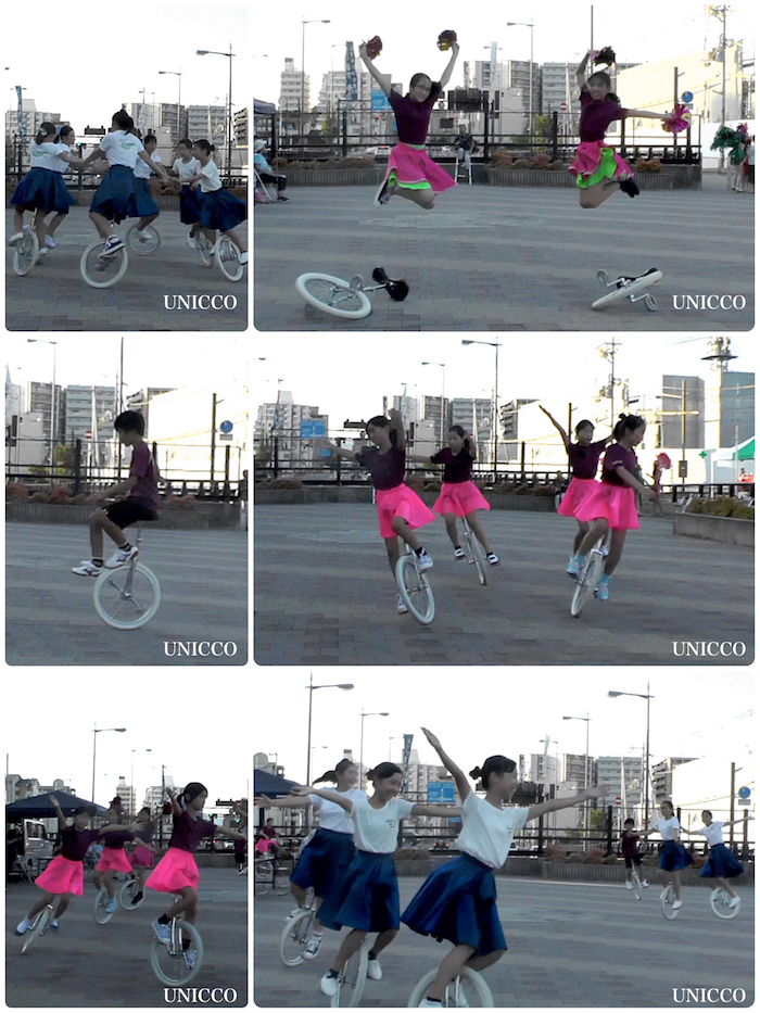 一輪車の技紹介・紹介した技を曲に合わせてのグループ演技2組とペア演技で一輪車演技をさせていただきました。