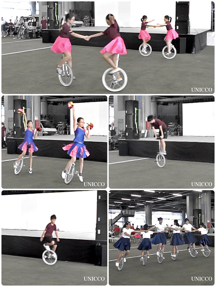 「一輪車技を披露する男子チーム」