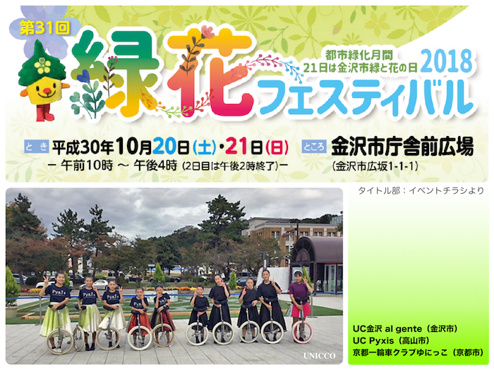 2018年10月20日に金沢市で行われました、「緑花フェスティバル2018」のステージに出演しました。 今回のイベント出演は、UC金沢 al gente(金沢市)さんからのお誘いを受け、UC Pyxis(高山市)と京都一輪車クラブゆにっこ(京都市)の3団体合同でソロ演技・ペア演技・グループ演技発表をさせていただく事となりました。 ステージでは、綺麗なアーティスティック演技・パワフルなテクニカル演技と色々なタイプの演技を、皆さんにご覧いただく事ができ、出場メンバーも楽しく演技をさせていただきました。 UC金沢 al genteさん、準備から調整・運営まで大変ありがとうございました。 UC Pyxisさん、全ての参加メンバーさんへのサポート、大変ありがとうございました。 主催の金沢市・(公財)金沢まちづくり財団・緑を育て金沢を美しくする会・の皆さん、また、協力・後援の皆さん、当日は大変お世話になり、ありがとうございました。 |